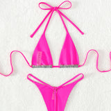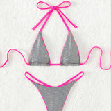 Be the most stunning babe on the beach in this fun and flirty two-piece bathing suit. It's all the vibe you need to make a statement, with the contrast binding for flattering your skin. The stunning shimmering fabric with checkered pattern is the best to prove your top swim aesthetic. We love the micro triangle cut with fixed soft pads and super thin ties create a sexy halter neck. The G-string thong bottom is perfect for minimal tan lines for beach babe like you.