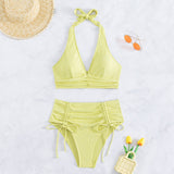 Sexy Ruched Tie High Waist Ribbed Halter Brazilian Two Piece Bikini Swimsuit