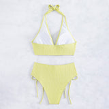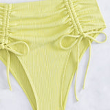Make a splash this spring break with our pastel yellow bikini set! This moderate two-piece swim set features a trendy high-waisted bikini bottom that accentuates your waist, balancing coverage and allure with chic drawstring ties. The plunging neckline and ruched band of the halter bikini top enhance your silhouette, while the soft, ribbed fabric ensures ultimate comfort. Ideal for lounging poolside or making a statement at your next tropical getaway, this Brazilian-style swimwear is sure to turn heads!