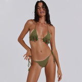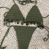 Turn heads in this boho-chic crochet bikini set, unlined and pad-free for a truly natural feel. Hand-knitted in earthy olive green, the sliding triangle knit top features playful beaded tassels that dance with every breeze. The matching cheeky bottom, with its high-cut design, ties at the sides with coordinating beads. A vacation-ready, free-spirit piece made for carefree beach days and sun-soaked escapes.