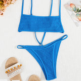 Experience beach beauty with our sexy textured bathing suit. The square-shaped bikini top showcases natural beauty without padding, featuring adjustable spaghetti shoulder straps that tie at the back for a personalized fit. The cheeky swim bottom offers a daring silhouette with just the right amount of coverage. Textured fabric adds depth and interest to this vacation-vibe solid blue two-piece swimwear, creating a modern and sophisticated look perfect for sunny days by the water. Enjoy the warmth of summer and the cool breeze in this minimalist swim set.