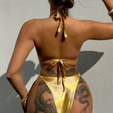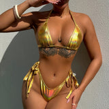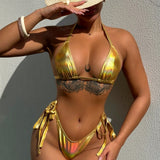 Shiny Metallic Tie Side Cheeky Slide Triangle Brazilian Two Piece Bikini Swimsuit