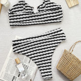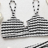 Ready for your close-up? Our retro striped swim set ensures you shine in every sun-kissed moment. This vintage two-piece bathing suit features a bralette bikini top with adjustable spaghetti shoulder straps and a metallic notch ring, accented by a captivating center cut out. The stretchy back band and removable padding ensure a perfect fit. The high-waisted, cheeky swim bottom offers a flattering silhouette, enhanced by classic black and white lines. This athletic smocked swimwear is an essential addition to your beach wardrobe.