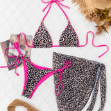 Flaunt your wild side in this leopard print bikini set for women, complete with a matching sheer sarong. Featuring a sliding triangle swim top with removable pads and hot pink straps, plus a sexy cheeky bikini bottom that ties at the sides for a perfect fit. The right amount of coverage and bold, fully lined design flatters every curve, while the mesh skirt adds a semi-sheer effect. This three-piece swimsuit is your go-to beach outfit this summer!