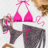 Wild Leopard Tie Side Cheeky Triangle Halter Brazilian Three Piece Bikini Swimsuit